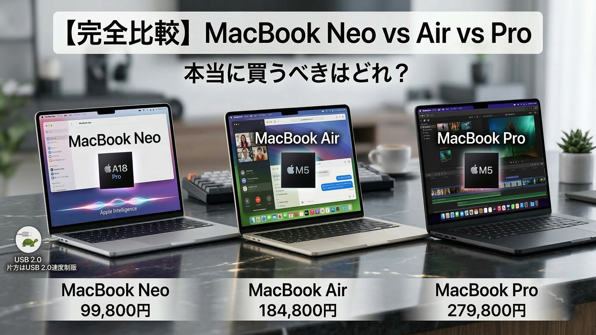 - MacBook Neo: USB 2.0の制限やバックライトなしという「コストカットの事実」を理解した上で、とにかく安く最新のmacOSとAI機能を使いたい割り切り派向け。