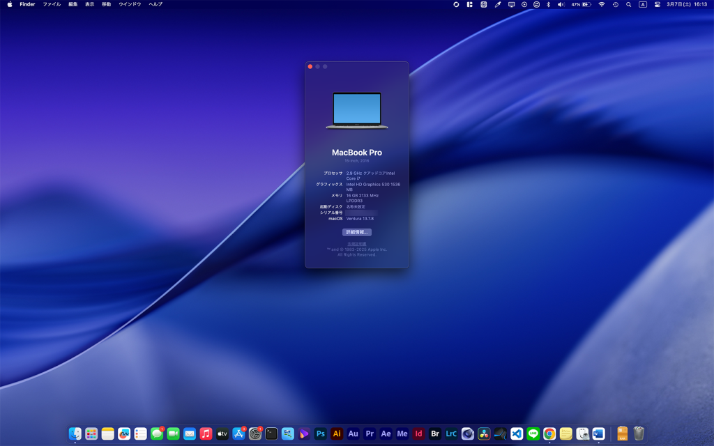 まずOSについて。2016年モデルの公式サポートはとっくに終了しており、普通に使えばmacOS Montereyが限界です。しかし、今回は「OpenCore Legacy Patcher (OCLP)」を使用して、無理やりmacOS Venturaをインストールしてみました。