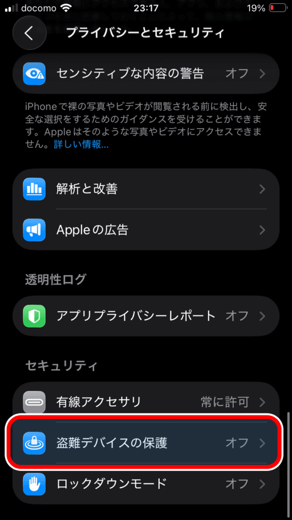 最近のiPhoneは「盗難デバイスの保護」というセキュリティ機能がデフォルトで有効化されており、「iPhoneを探す」を無効にできない場合があります。
