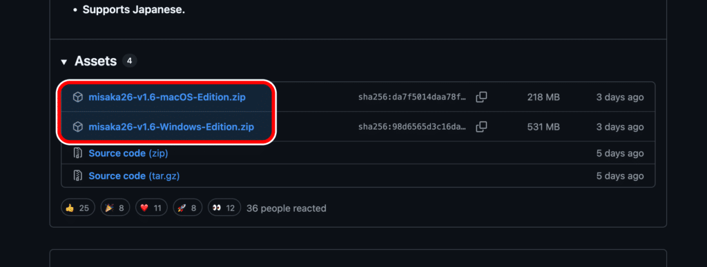 下にスクロールし「Assets」から自分のOS向けのアプリをダウンロードします。