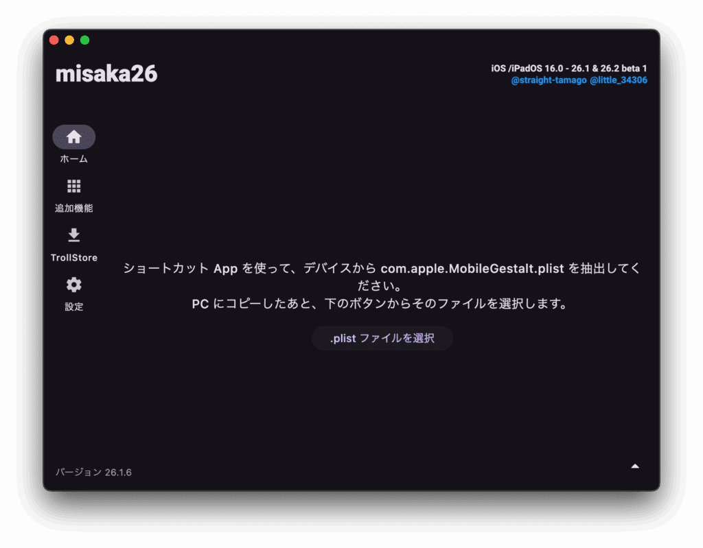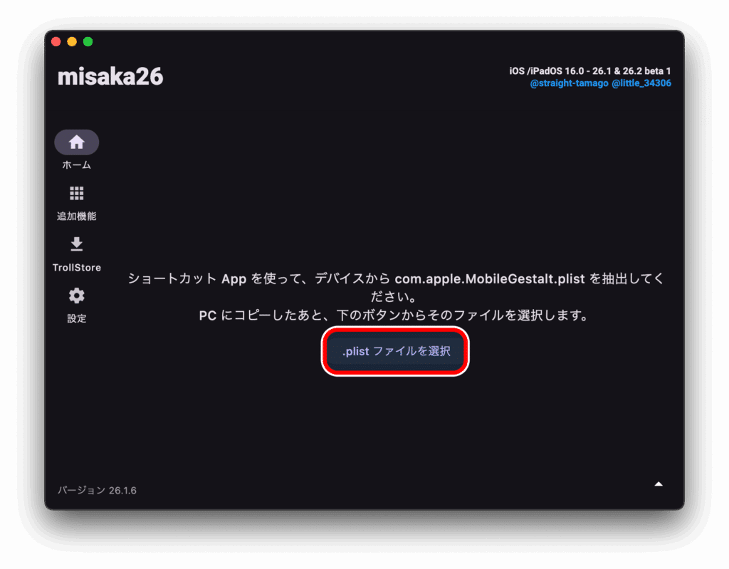 Misaka26を起動し「.plistファイルを選択」をクリックし、先程iPhoneから抽出したMobileGestalt.plistファイルを選択します。