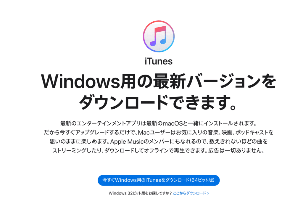 下記URLからダウンロード・インストールができます。Microsoft Store版のiTunesがすでにインストールされている場合は事前にアンインストールしてください。