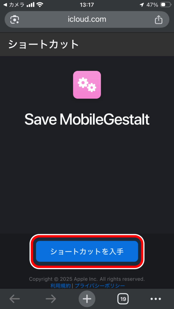 まず、以下のURLを開き「ショートカットを入手」をタップしショートカットをダウンロードします。