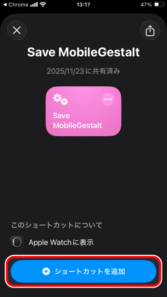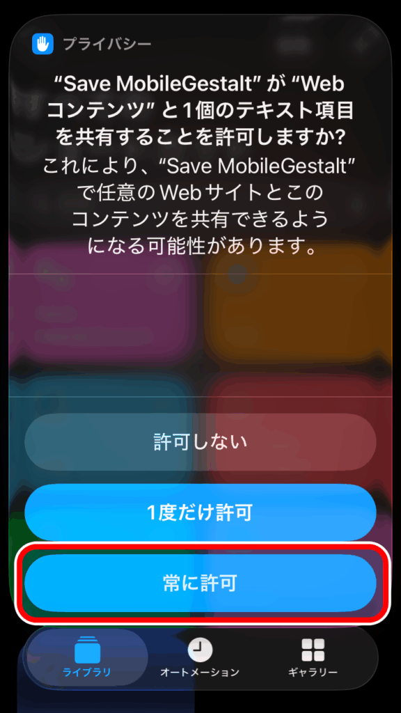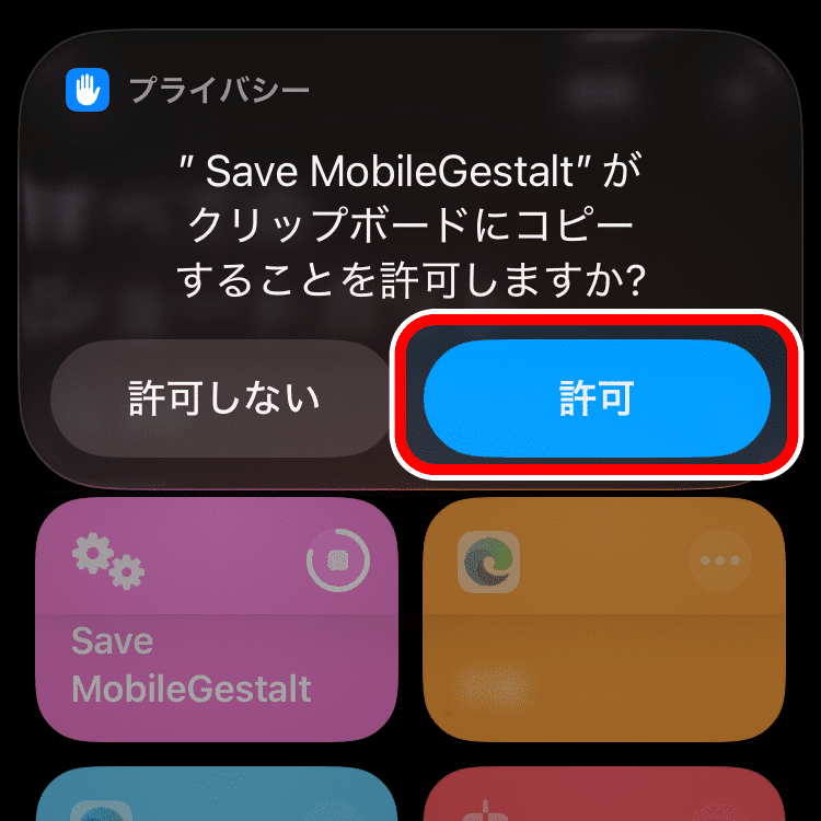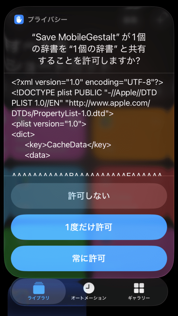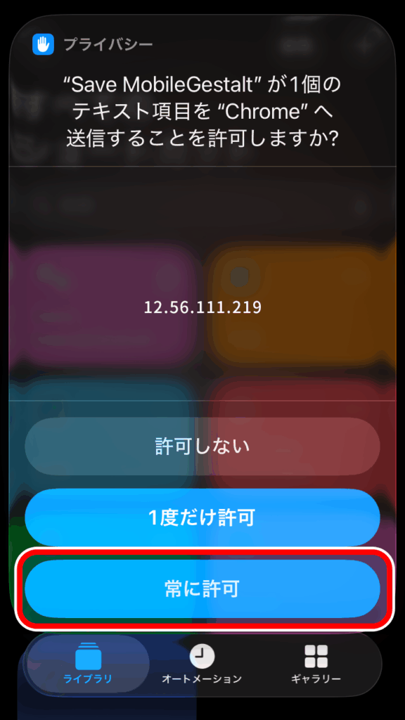 追加した「Save MobileGestalt」ショートカットをタップし権限を許可するかのポップが表示されるので「常に許可」をタップします。