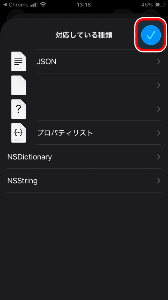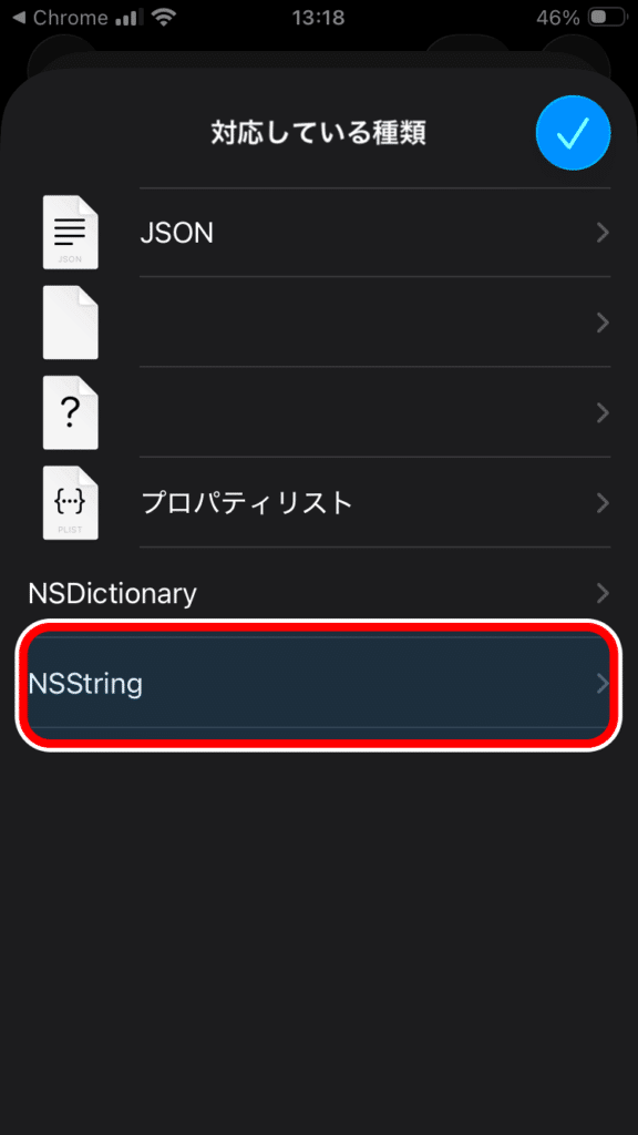 「対応している書類」というページが表示されるのでその中の「NSString」をタップします。